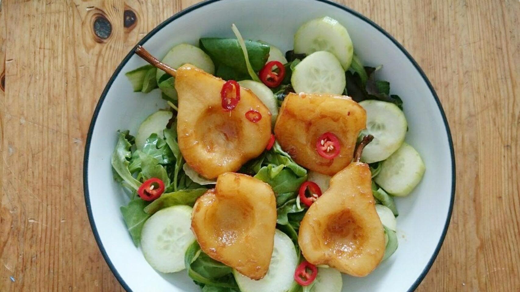 [vc_row][vc_column width=”1/2″][vc_column_text]Ingredientes: 4 peras pequeñas 1 lechuga pequeña 1 pepino 2 cdas de salsa de soja 2 cdas de Miel…